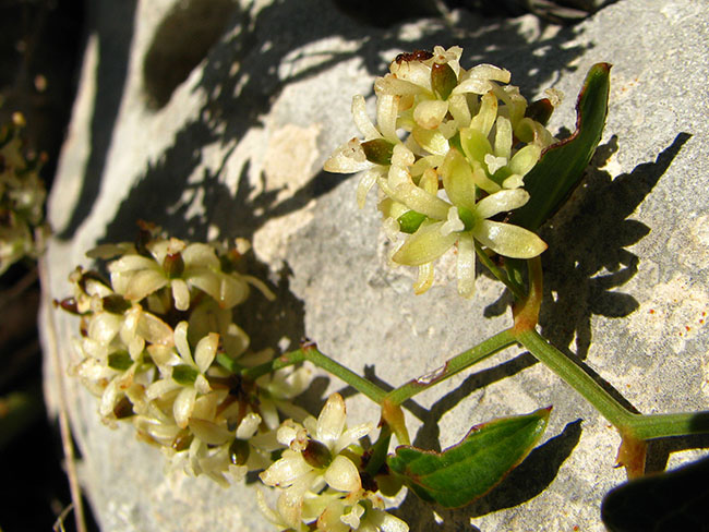Fleurs jaunes-verdâtres, petites, dioïques, en ombelles