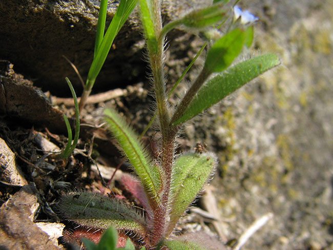 Fleurs bleu pâle, presque planes, à 5 pétales, à poils appliqués ; calice hérissé de poils crochus, petit, fermé après la floraison ; pédicelle fructifère grêle, étalé, écartés, les inférieurs environ 2 fois plus longs que le calice.