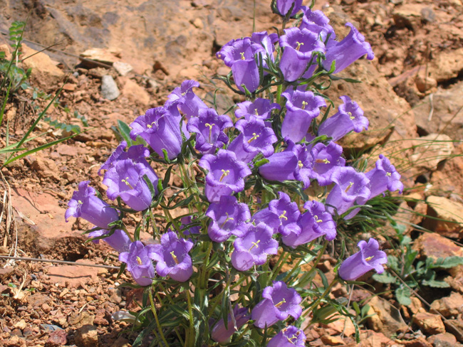 Fleurs à grande corolle bleu-violacée, à lobes peu profonds, dressées, nombreuses, en longue grappe pyramidale, sur de longs pédoncules à 2 bractées aussi longues que les sépales : calice poilu à 5 lobes ovales-lancéolés.