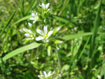 Fleurs blanches, groupées en têtes compactes, 5 pétales à 2 lobes presque de la même taille que les sépales lancéolés-aigus, poilus même au sommet. Feuilles opposées, sessiles, poilues, ovales et obtuses. Tige dressée, velue, vert-jaunâtre.