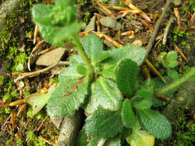 Feuilles ovales, dentées, en rosette à la base, celles de la tige distantes et embrassantes.