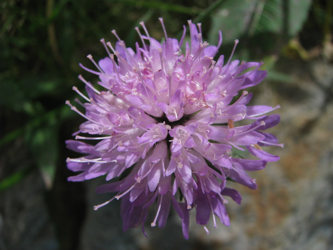 Fleurs roses ou lilas, les extérieures à peine rayonnantes, en têtes hémisphériques; involucre à folioles lancéolées, pointues, presque aussi longues que les fleurs; calice à dents lancéolées, terminées par une petite pointe, égalant la moitié du calicule.
