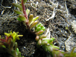 Tige de 2-5 cm, sans poils, ascendante, vert sombre, les stériles, nombreuses, à feuilles densément imbriquées.