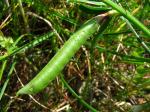 Fruit en gousse plate, assez large, noircissant et vrillant à maturité.