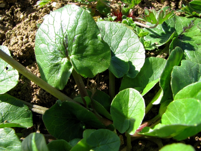Feuilles en forme de coeur, toutes à la base, couchées au sol, longuement pétiolées.