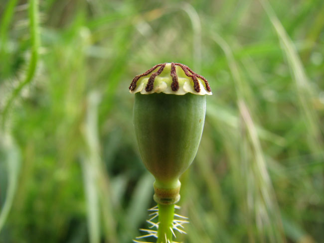 Papaver rhoeas : Capsule courte et poils hérissés sur le pédoncule floral.