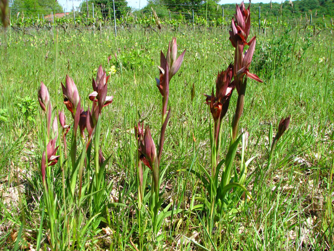 Fleurs rouges, grandes, 3-10 en épi élancé; bractées très longues et aiguës, dépassant ordinairement les fleurs; labelle pourvu d'une pilosité blanchâtre dense et longue, muni à la base de 2 lamelles blanchâtres à pourpre foncé, parallèles ou divergentes, parfois soudées à l'extémité; lan,guette concave, à lobes latéraux cachés sous le casque.