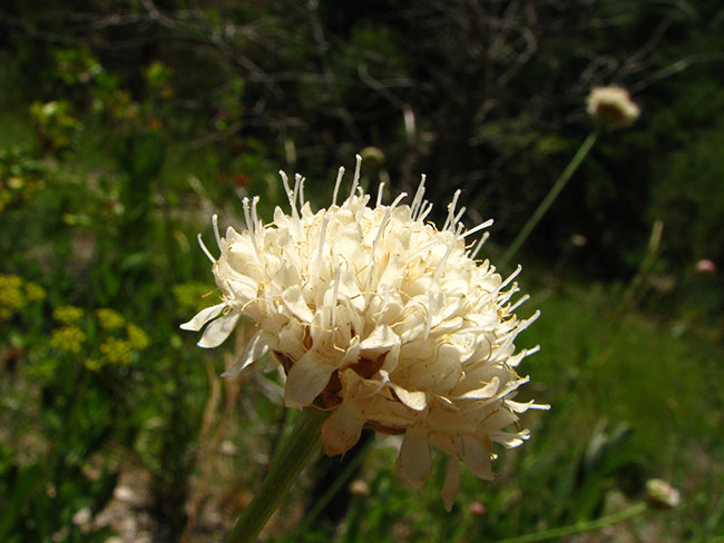 Fleurs blanches, en tête globuleuse, dressées, involucre à folioles membraneuses, sèches et minces, triangulaires-arrondies, bien plus courtes que les fleurs, étamines saillantes.