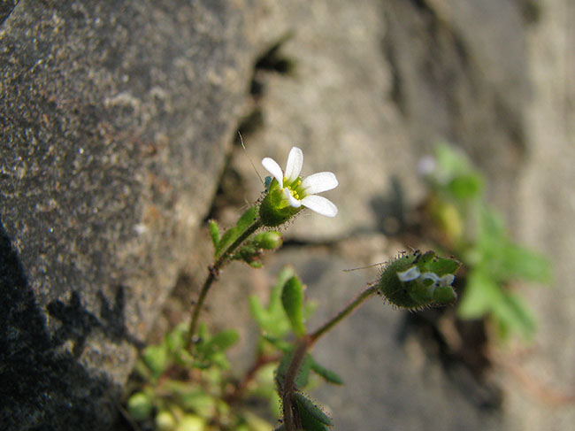Fleurs blanches, petites (4-6 mm de long), en cyme irrégulière, à pédicelles filiformes, la plupart 3-5 fois plus longs que le calice; sépales dressés, elliptiques, obtus, plus crouts que le tube presque globuleux; pétales en coin, tronqués, 1 fois plus longs que les sépales.