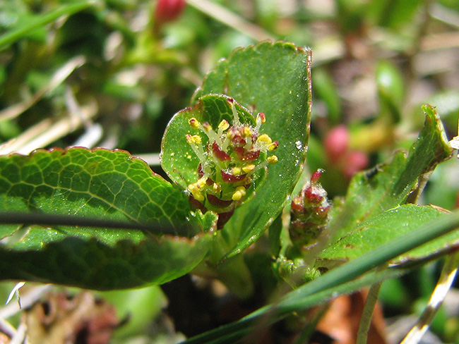 Sous-arbrisseau de 10-30 cm, tortueux, à tige souterraine rampante et r'adicante, à rameaux grêles, presque herbacés, sans poils.