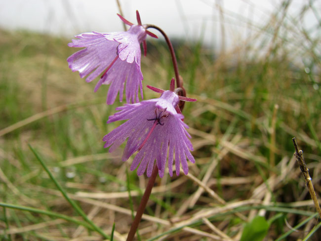 Fleurs roses ou violacées, penchées, 1-4 en ombelles à pédicelles inégaux, renflés et glanduleux au sommet, dépassant les folioles linéaires de l'involucre;