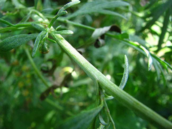 Feuilles gris-verdâtre dessus, blanches en-dessous, soyeuses, profondément découpées en lanières